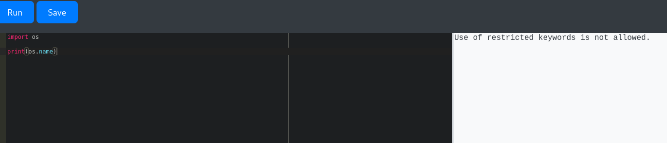 Start with a simple code print(os.name), realized that there were restricted words (os, sys, platform, import,….etc) that i don’t have access to, indicating some type of WAF exists in place.