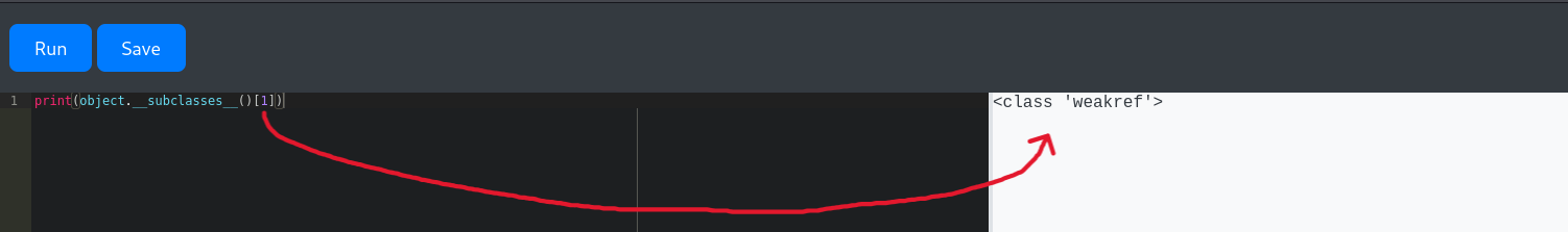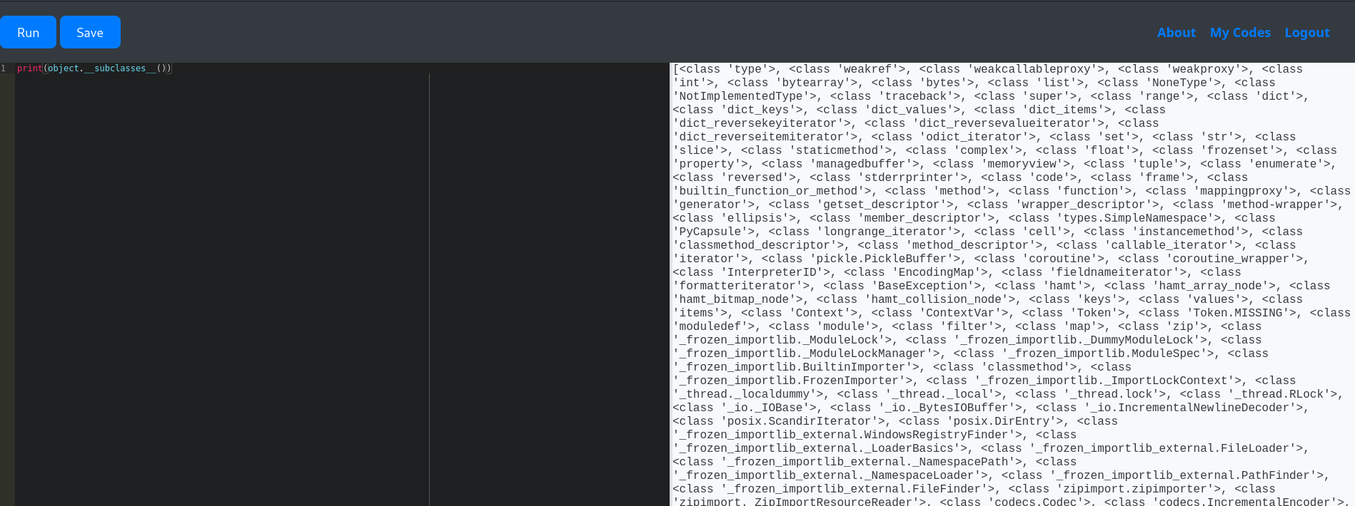 We have nothing now, we need a way to execute arbitrary commands (since this is a common thing in HTB, get into the system and read the flag). One way to do that is to find classes that will help to execute commands on the server. To do this, we first need to know the classes that exist in the server or the Python environment. There are several ways to do that.