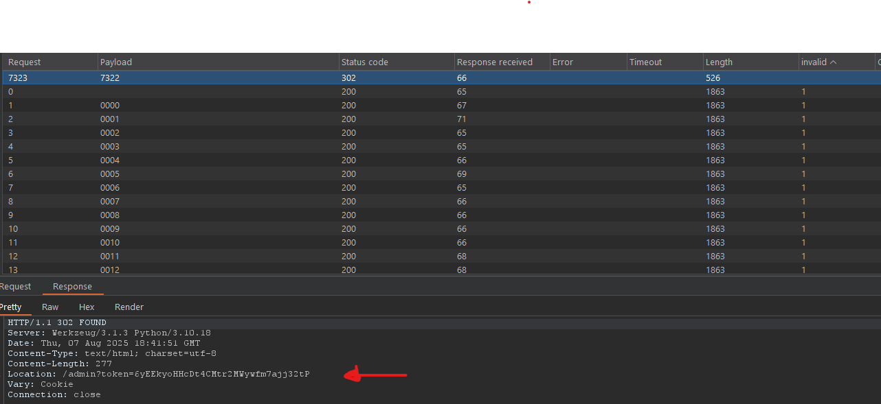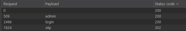 main()I intercept the otp request again, send it to the intruder, and start brute forcing using the wordlist i just made.