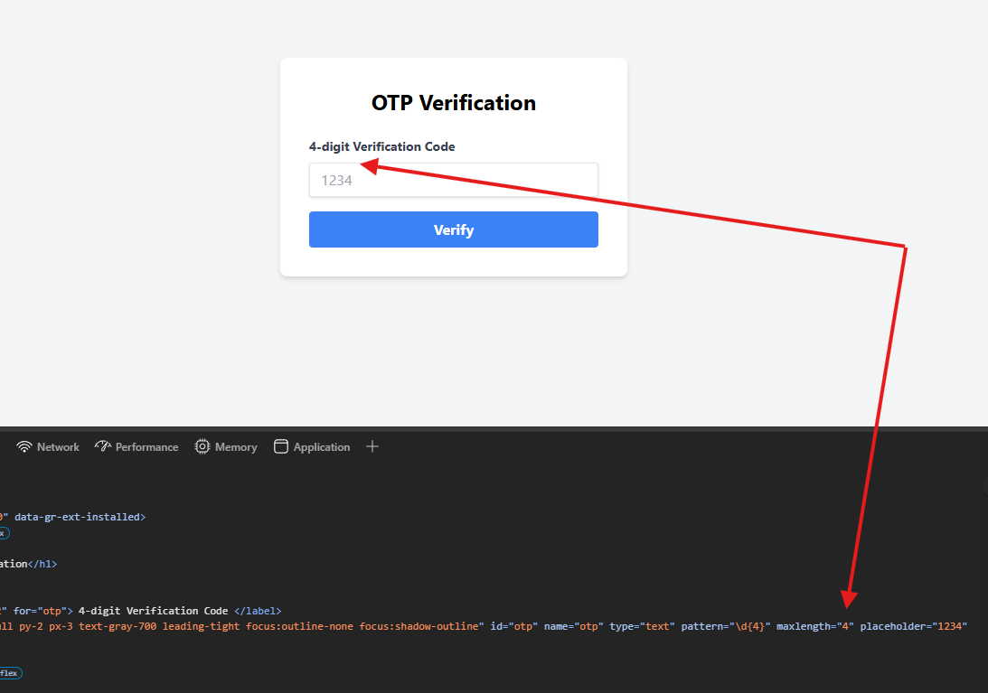 After using the above creds, we can log in now. Noticed you get redirected to /otp endpoint. The otp requires 4 digits, and the site was checking it on the front end. I tried to manipulate that and add more digits to see what happens.