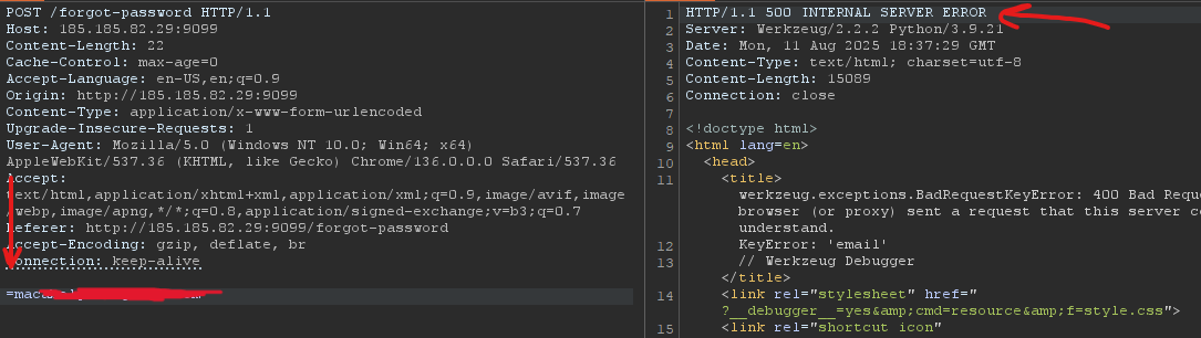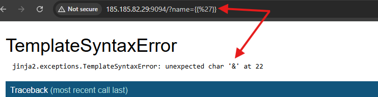 Suddenly, we got an error. This indicates the debugger was open. The important thing here is that we got the template engine, it’s jinja2, and we got a weird SyntaxError says unexpected char '&'. Where does that character come from??