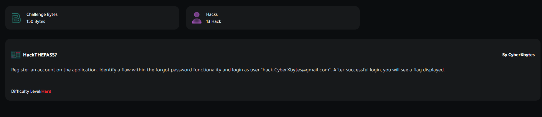 Register an account on the application. Identify a flaw within the forgot password functionality and login as user “hack.CyberXbytes@gmail.com“. After successful login, you will see a flag displayed.